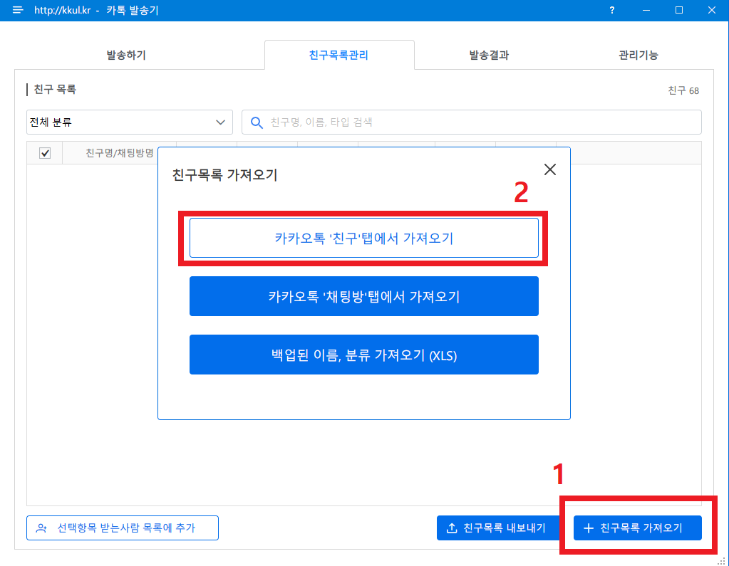 [친구목록관리] 탭에 [친구목록 가져오기]선택 후 [친구탭에서 가져오기] 선택
