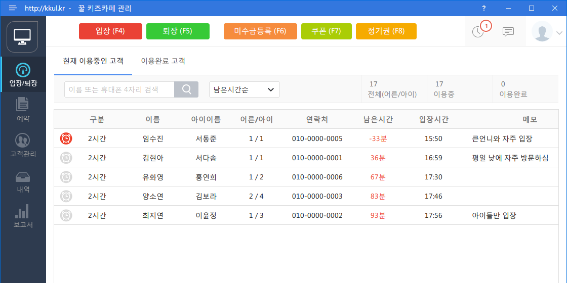 입장이 아이 이름이나 별칭을 지정해서 표시 하거나 가단한 메모를 같이 입력해 두고 고객의 특징이나