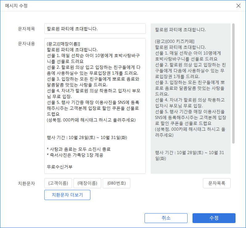 문자포멧 작성시 치환이 필요한 부분은 치환문자 더보기를 눌러서 필요한 항목을 추가해 주시면 됩니다.