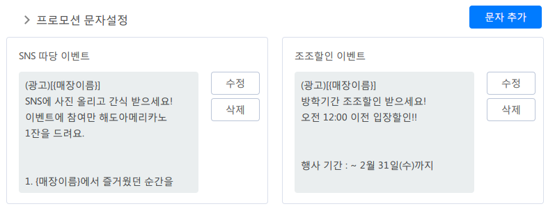 쿠폰관리와 문자관리 화면에서 프로모션에 진행에 필요한 쿠폰과 문자메시지 설정이 필요합니다. 기본으로 제공되는 쿠폰과 문자메시지를 변경하셔서 사용하시거나 매장에 맞는 새로운 쿠폰을 추가해 주시면 됩니다.