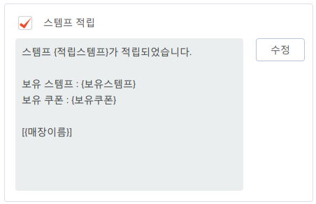 관리페이지의 자동문자전송에 스템프 적립과 정기권 구매시 자동으로 전송되는 문자설정이 가능합니다.