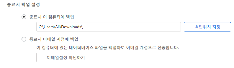 기본설정에서 프로그램 종료시기 백업 할 수 있는 설정이 있습니다.