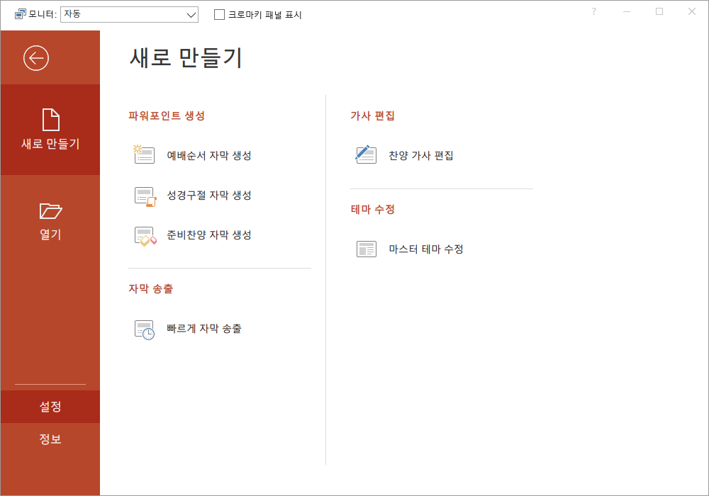 예배슬라이드 생성(SlideshowMaker) 실행시 처음 보이는 화면입니다.