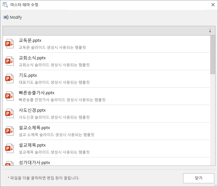 변경할 테마를 선택하고 Modify를 눌러서 변경을 하거나 더블클릭을 하면 PowerPoint를 실행하여 바로 변경이 가능합니다.