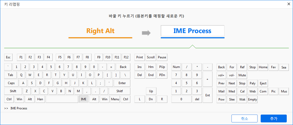 키보드 키 변경이 필요한 버튼을 선택한 후 "추가"를 누르시면 키 목록에 추가 됩니다.